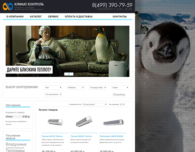 Магазин по продаже климатической техники, с возможностью оформления покупки через интернет. Информативные иконки техники и динамичный фон запомнятся посетителям надолго.